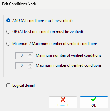 By setting the AND condition and activating the logical negation option, the node will be verified if at least one of its components is false (logical NAND operation).