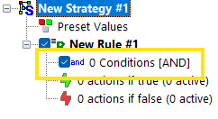 When starting a new strategy, a first empty condition node is created with the relationship between conditions set to AND.